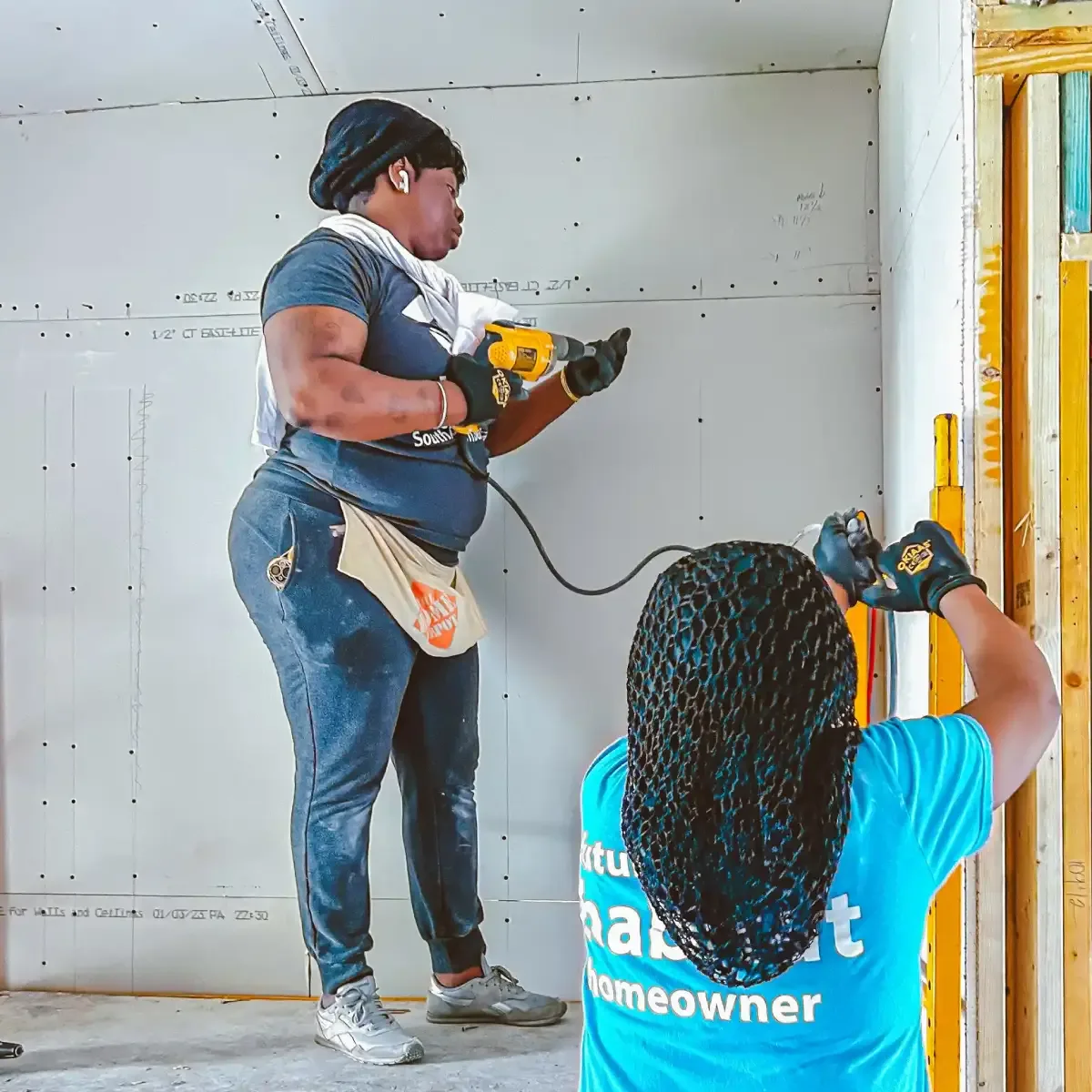 Construction volunteers participate in a hands-on team building activity helping build a new Habitat home for a family in need of safe, decent, and affordable housing. Participants work alongside our Habitat team and Partner Families. Activities vary depending on the stage of construction and can include roofing, framing, hanging drywall, exterior painting, landscaping, and more.